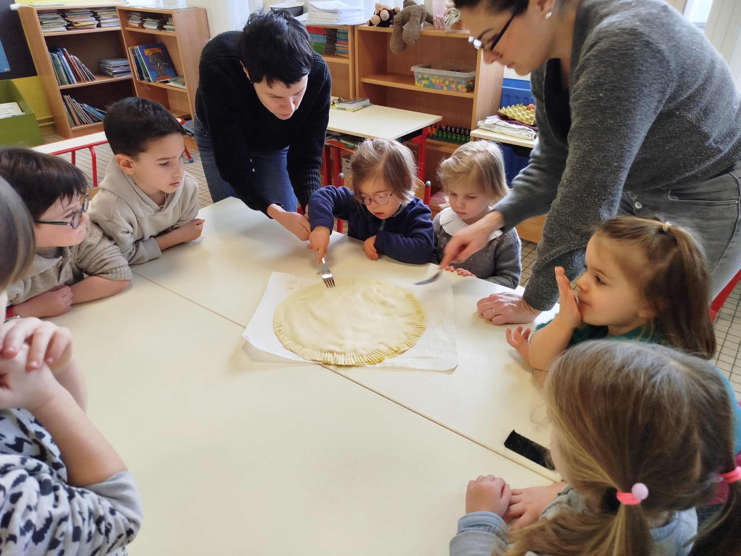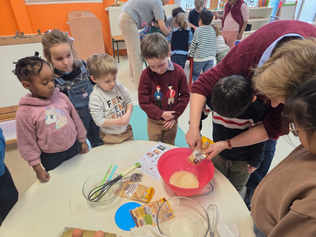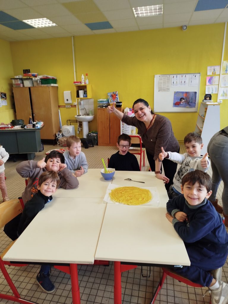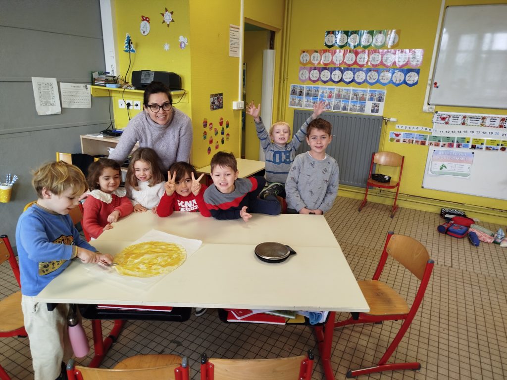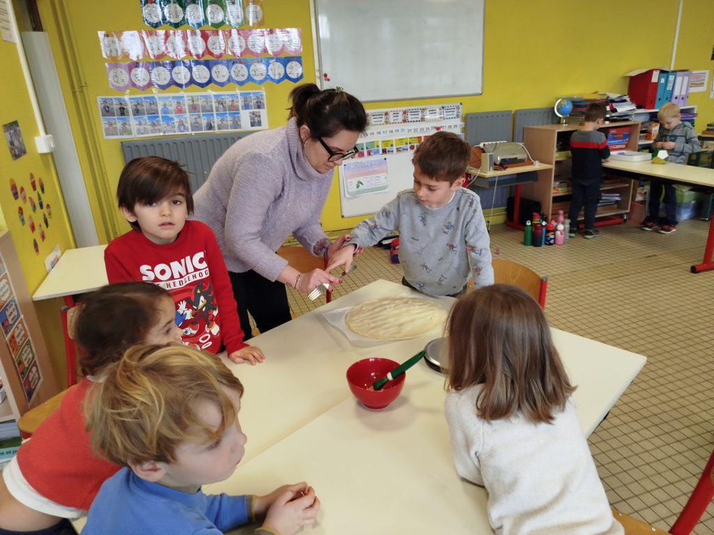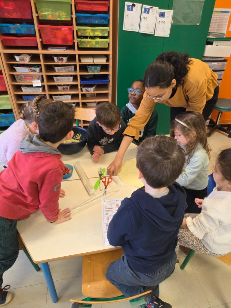 Les élèves de maternelle (PS-MS-GS) et de CP se sont associés pour confectionner de délicieuses galettes des rois. Les enfants des quatre niveaux se sont mélangés, ce qui a permis aux plus aguerris d’aider les plus timides. Chaque groupe a réalisé trois galettes.