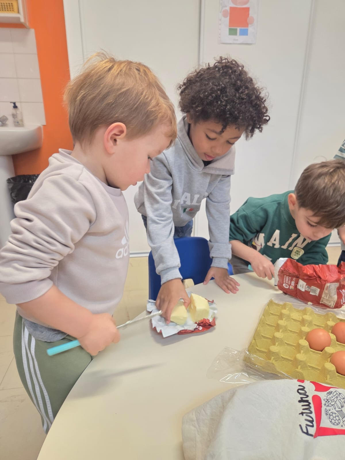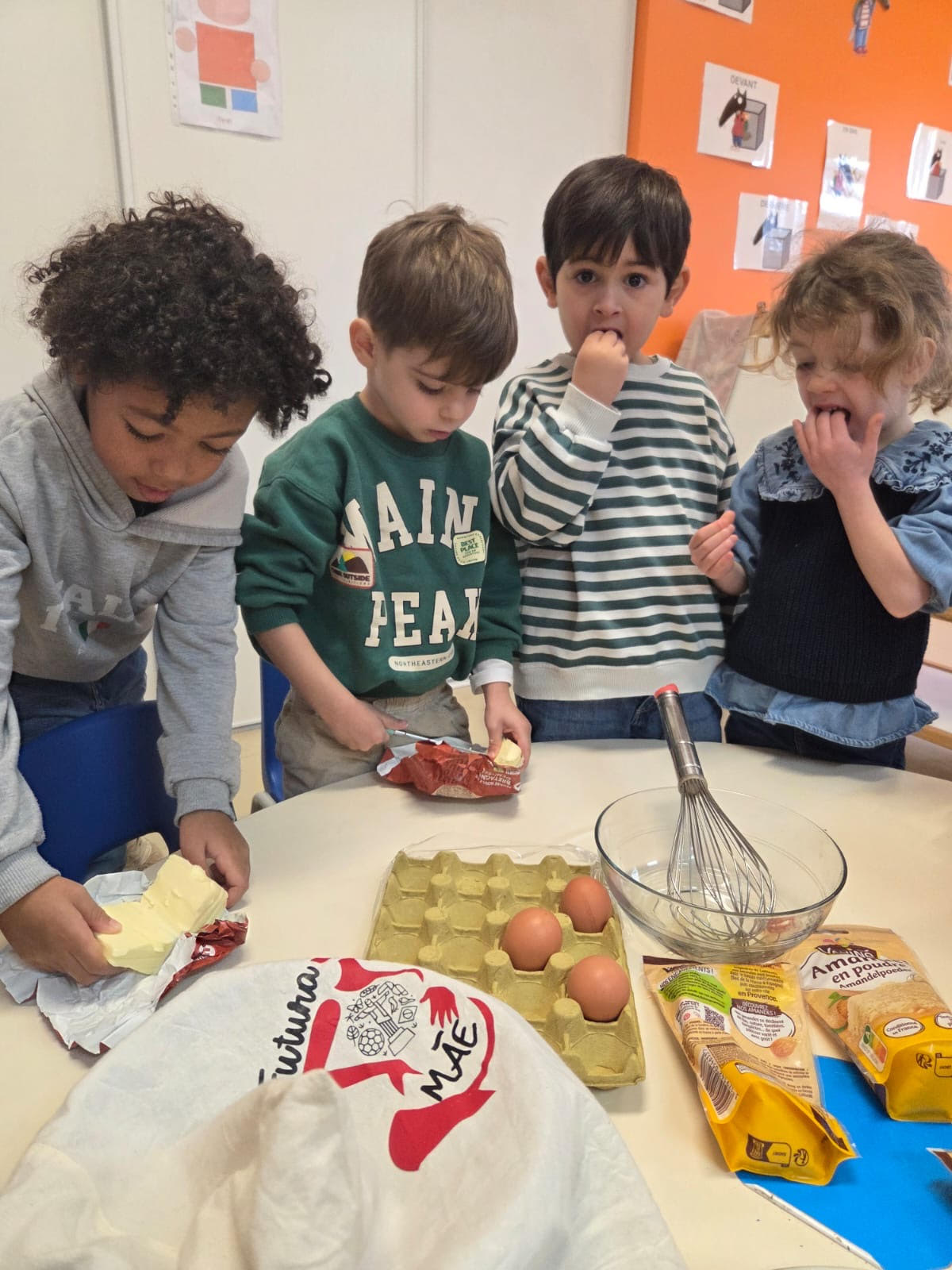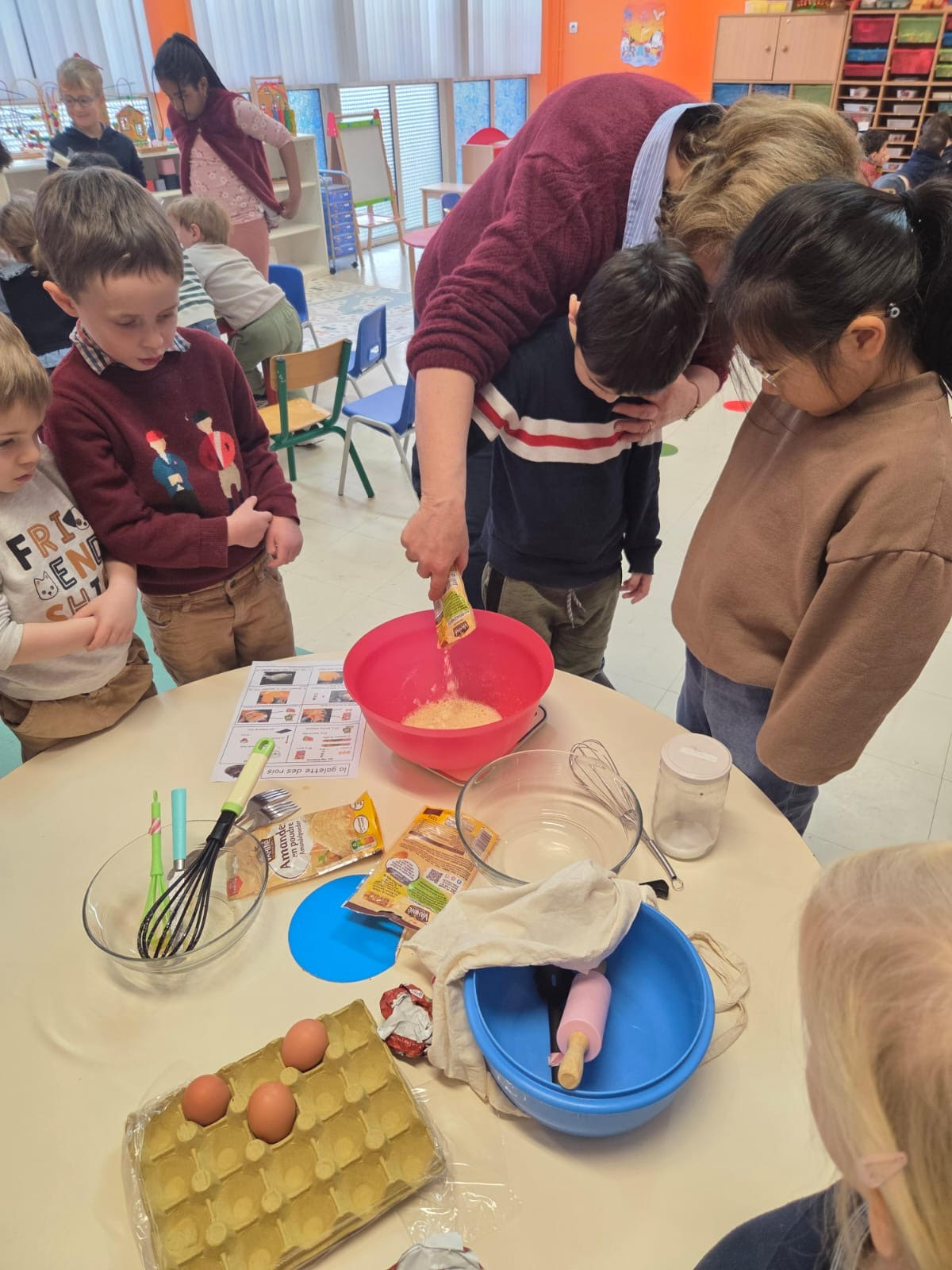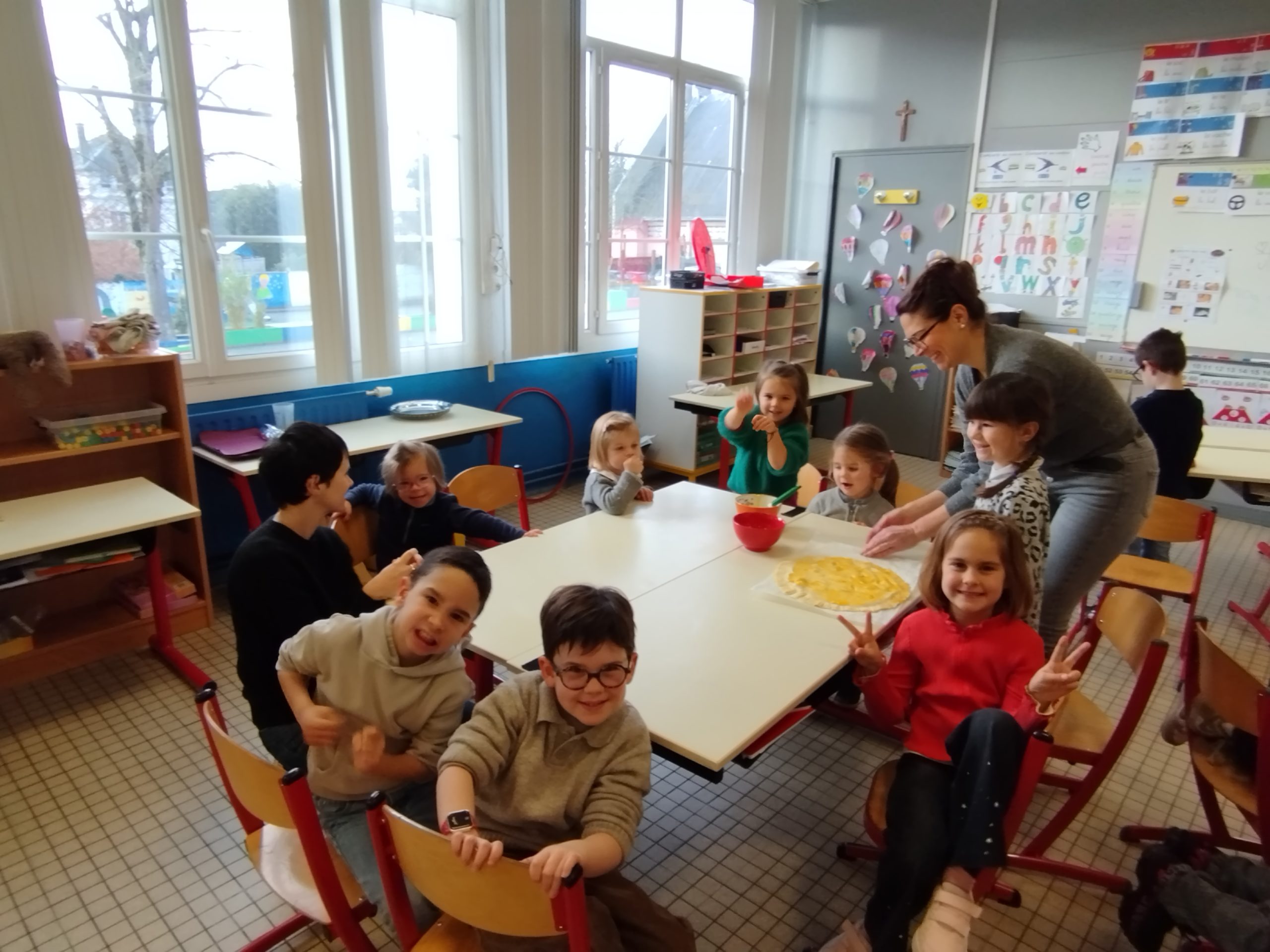 Les élèves de maternelle (PS-MS-GS) et de CP se sont associés pour confectionner de délicieuses galettes des rois. Les enfants des quatre niveaux se sont mélangés, ce qui a permis aux plus aguerris d’aider les plus timides. Chaque groupe a réalisé trois galettes.